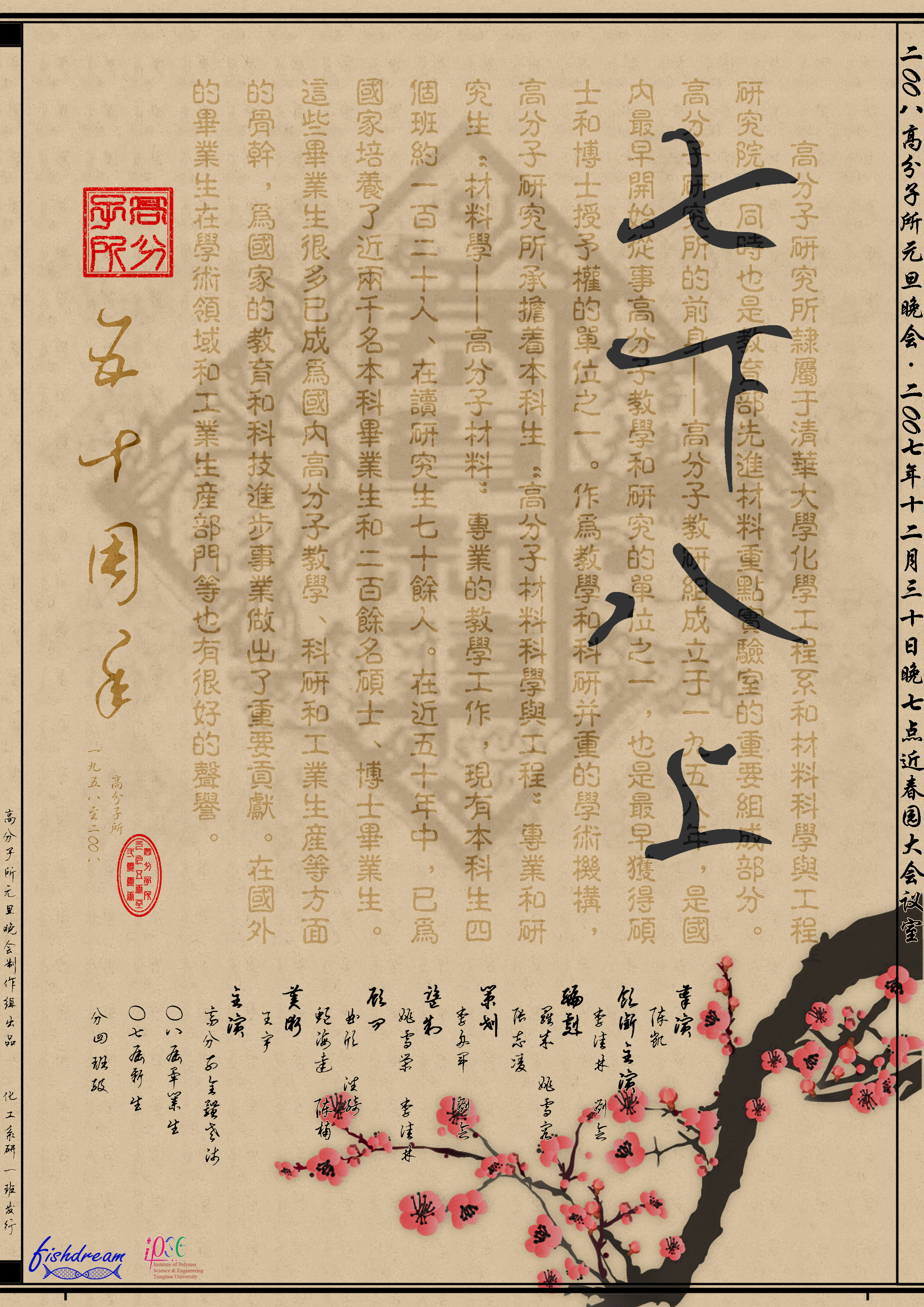 2007年12月30日,清华大学高分子研究所元旦晚会在热烈、祥和的气氛中胜利举行 。参加晚会的化工研一班同学、分4班同学以及全体老师纷纷献上了精彩的节目,掌声笑声此起彼伏,整个会场成了一片欢乐的海洋。